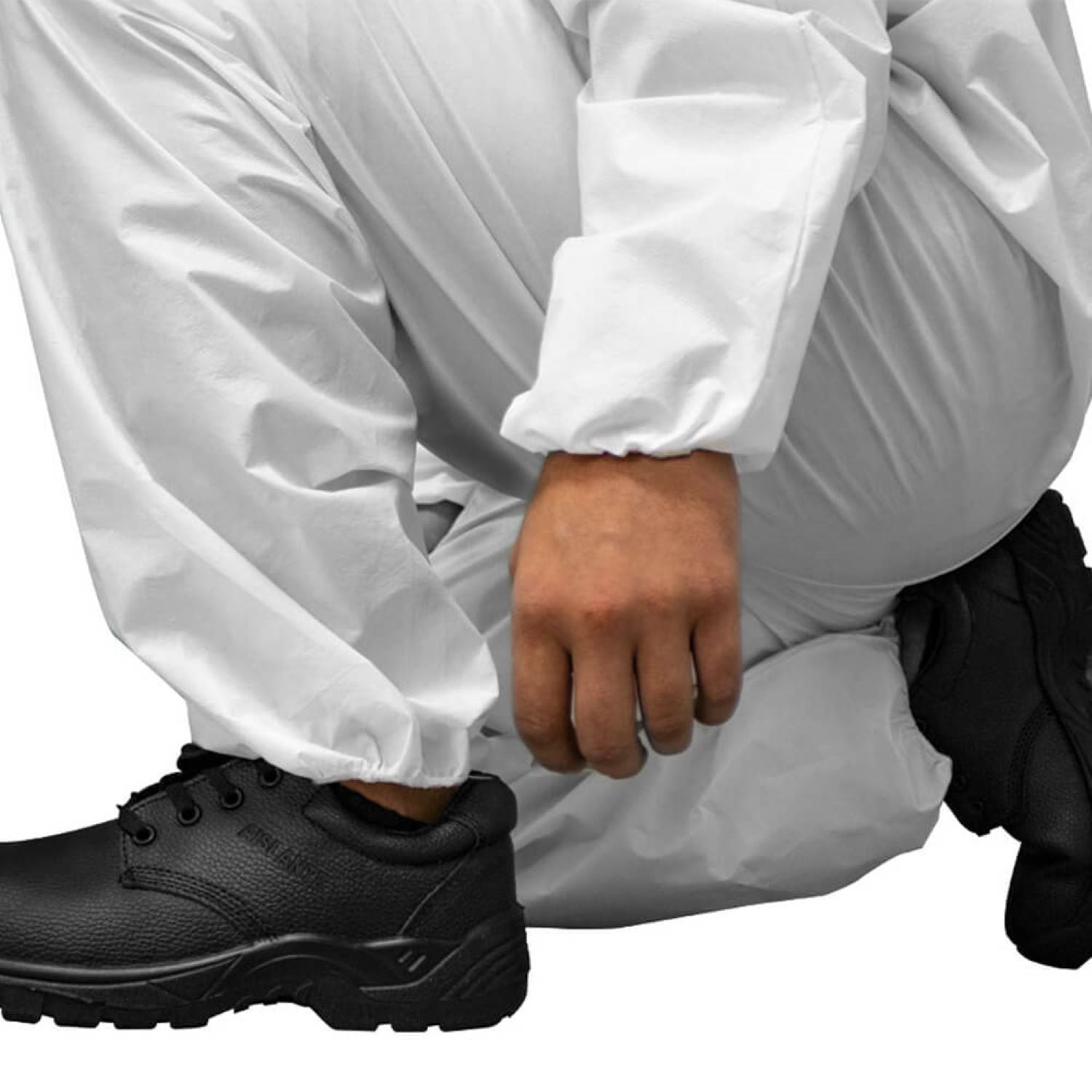 100% polietileno con película transpirable. Segunda capa de recubrimiento termofusible adhesivo. Tercera capa de 100% polipropileno. Propiedades antiestáticas. Antipartículas, antisalpicaduras. Cierre frontal unidireccional. Puños y tobillos elasticados para reducir al máximo el ingreso de partículas y salpicaduras de líquidos.